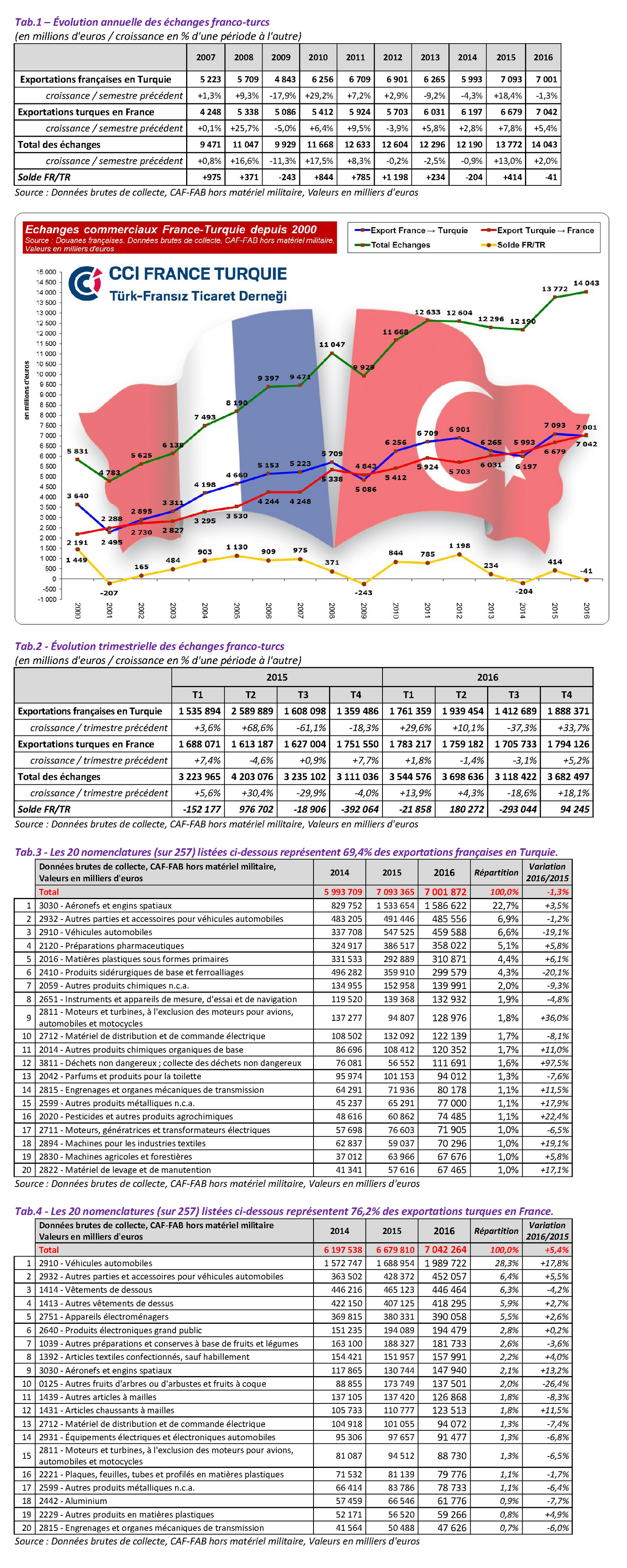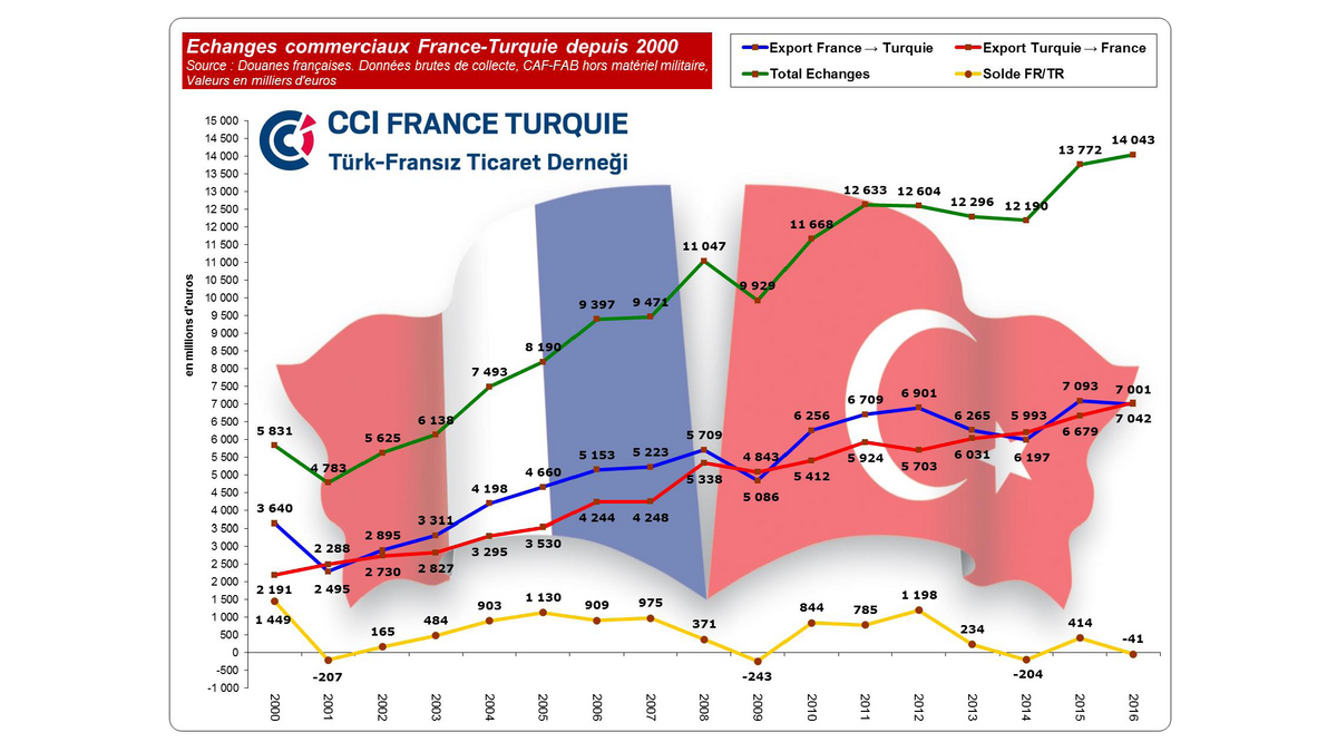 Le volume des échanges commerciaux franco-turcs, avec un montant total de 14,043 milliards € en 2016 est en augmentation de +2% par rapport à 2015 et atteint son plus haut historique. Une progression significative des ventes automobiles turques en France (+17,8%) est la principale raison de cette augmentation. Les exportations des entreprises françaises vers la Turquie reculent de -1,3% alors que celles des entreprises turques vers la France augmentent de +5,4%. Le solde de la balance commerciale entre les deux pays redevient bénéficiaire pour la Turquie (+41 millions € contre -414 millions € en 2015).