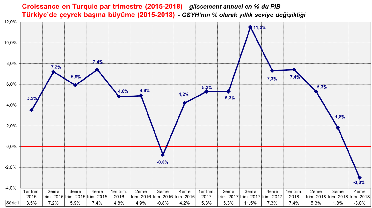 Sur l'ensemble de 2018, l'économie turque a enregistré une croissance de 2,6%, sa plus faible performance depuis 2009 (contre +7,4% en 2017). Par rapport au 3ème trimestre 2018, le PIB s'est contracté de 2,4% sur les trois derniers mois de l'année en données corrigées des variations saisonnières.