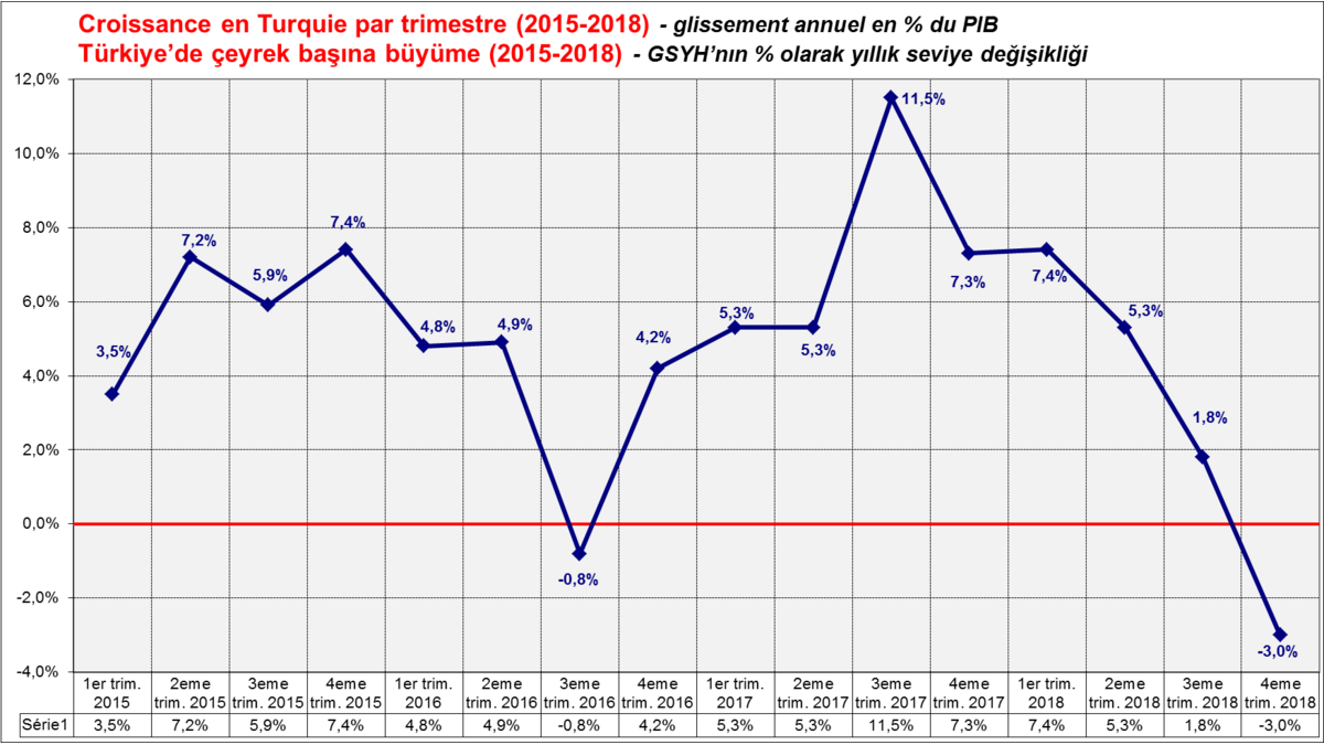 Turquie : contraction de la croissance de -3% au 4e trimestre 2018 ; +2,6% en 2018 bien en-deçà des objectifs fixés par le gouvernement à 3,8%