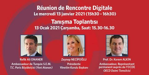 Nous souhaitons vivement votre participation à notre réunion de rencontre en présence de notre nouvel Ambassadeur de Turquie S .E.M. Refik Ali Onaner, nommé récemment à Paris et Prof. Dr. Kerem Alkin, représentant permanent auprès de l'OECD, le mercredi 13 janvier prochain de 15h30 à 16h30
