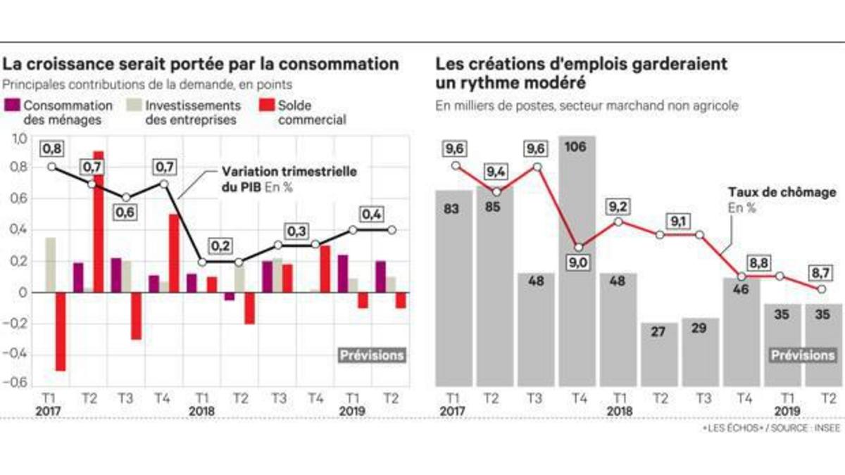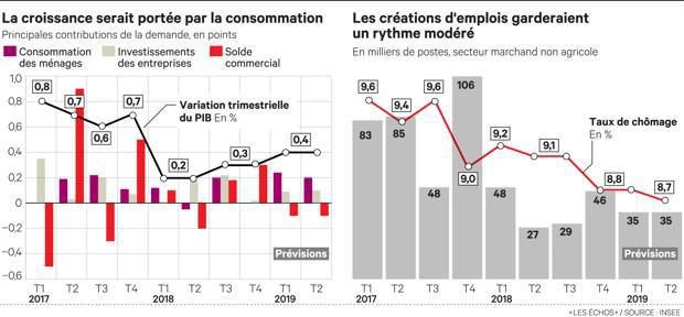 Insee, ilk yarıdaki büyüme tahminlerini Haziran sonunda +% 1,1 artış olarak hafifçe revize etti. Hükümet şimdi 2019'un tamamı için % 1,4'lük GSYİH büyümesi bekliyor. İşsizlik oranının, 2019 yılı ortasında, yıllık olarak 0,4 puan düşerek % 8,7 seviyesinde gerçekleşmesi bekleniyor.