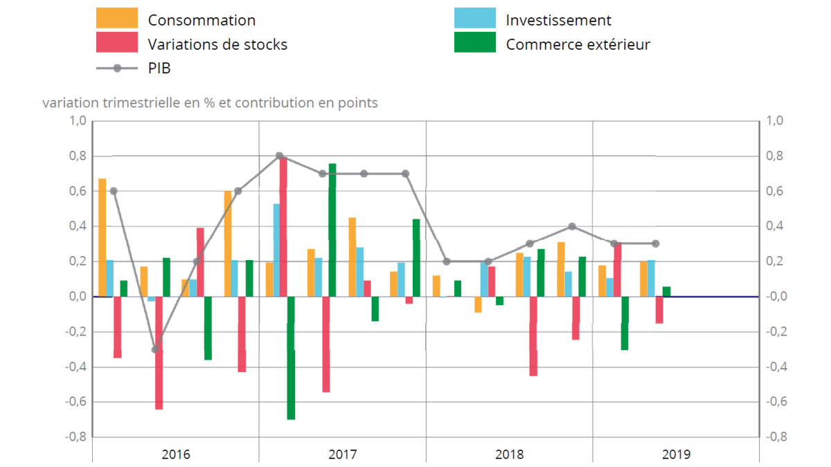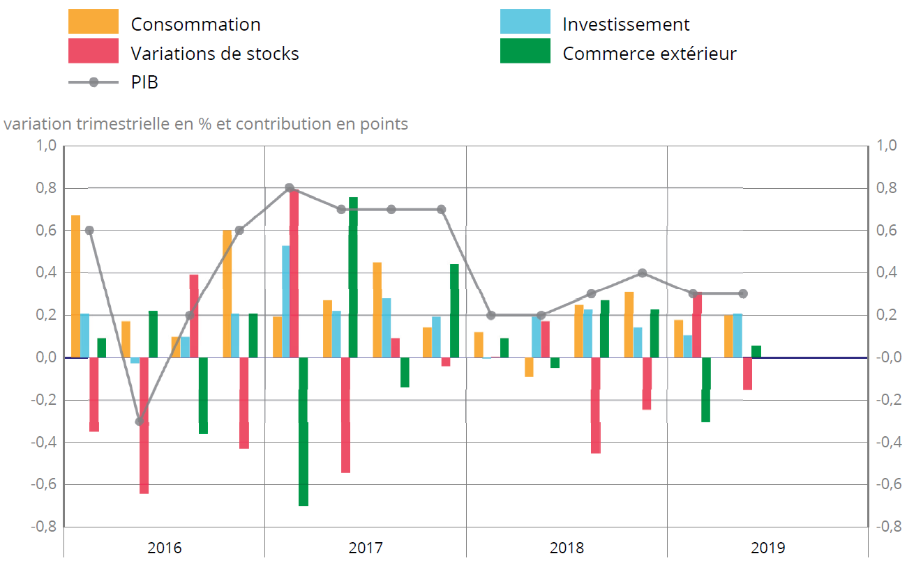 Hidrokarbon alımlarındaki düşüşe bağlı olarak ithalat hafif düşüş gösterirken (+% 1,1 sonrasında -% 0,2), ihracat ise sabit kaldı (+% 0,1'den sonra % 0). Genel olarak, dış dengenin GSYİH büyümesine katkısı bir miktar olumludur: Bir önceki çeyrekteki - 0,3 puandan sonra + 0,1 puandır. Tersine, stok değişikliklerinin olumsuz katkısı bulunmaktadır. (+ 0,3 puandan sonra – 0,2 puan).