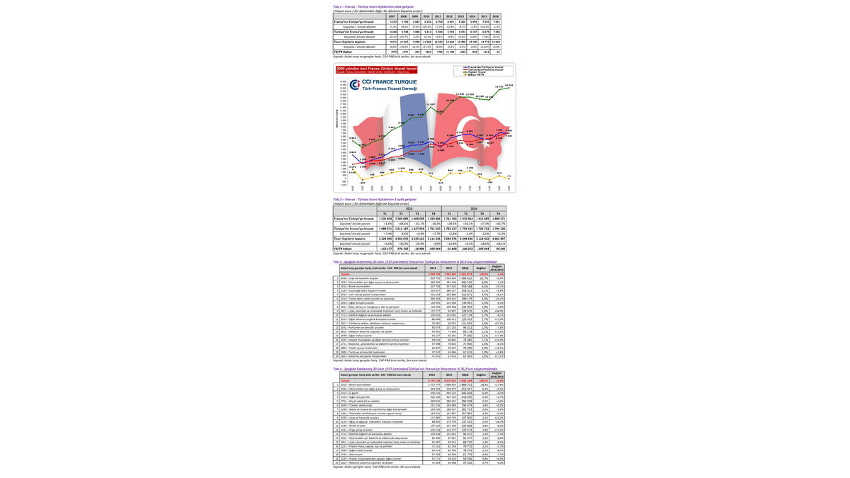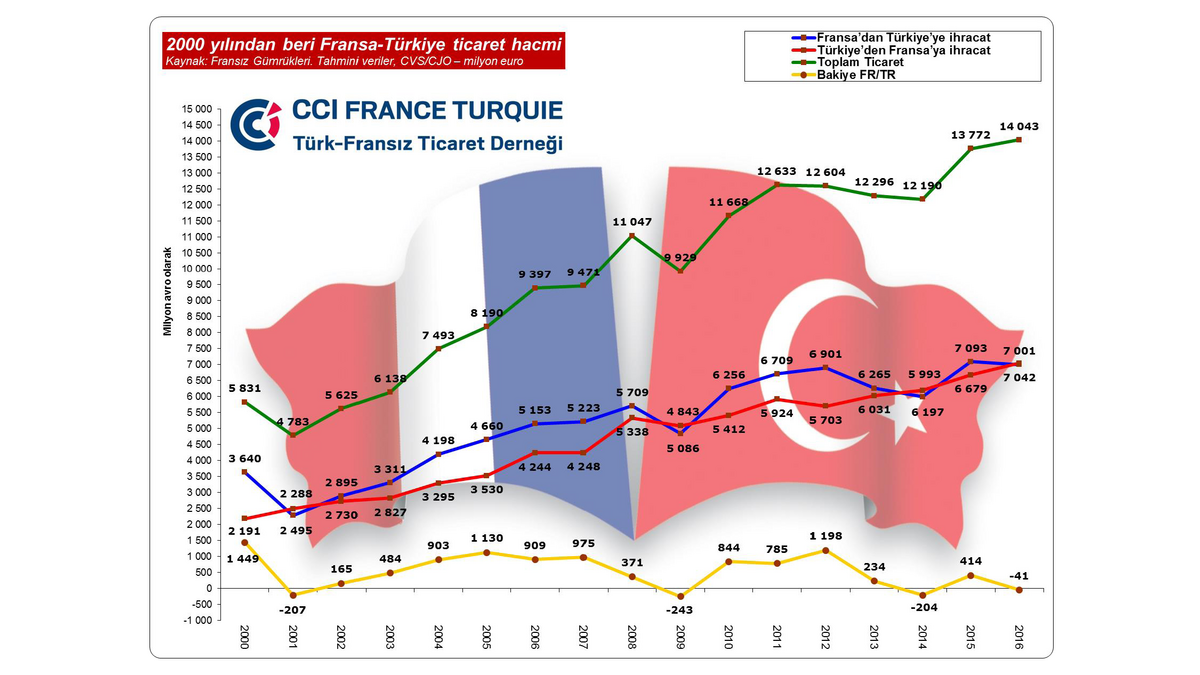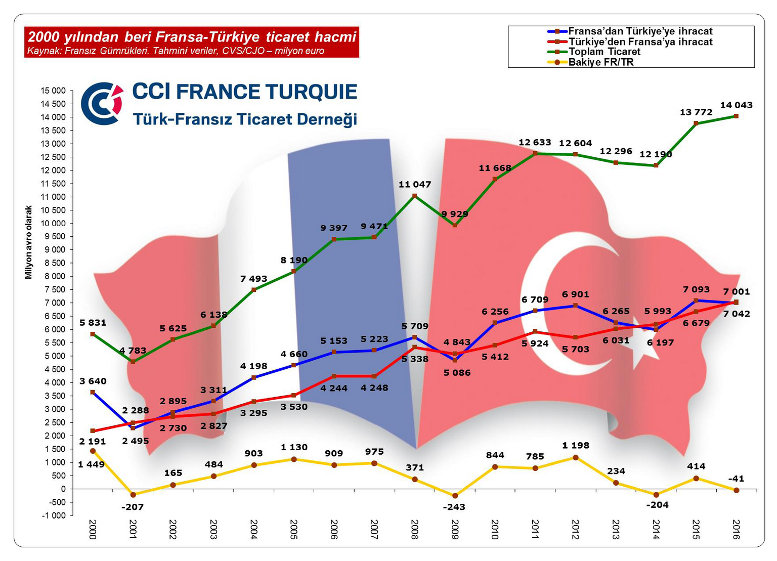 2016 yılında Fransa-Türkiye ticari ilişkiler hacmi 14,043 milyar euro ile 2015 yılına göre +%2 arttı ve tarihi zirvesine ulaştı. Fransa’ya Türk otomobillerinin satışında kaydedilen güçlü ilerleme(+%17,8) bu artışın temel nedeni oldu. Fransız firmalarının Türkiye’ye ihracatı-%1,3 oranında gerilerken Türk firmalarının Fransa’ya ihracatı +%5,4 arttı. İki ülke arası ticari denge bakiyesi Türkiye lehine gelişti(2015’deki -414 milyon euroya karşın +41 milyon euro).