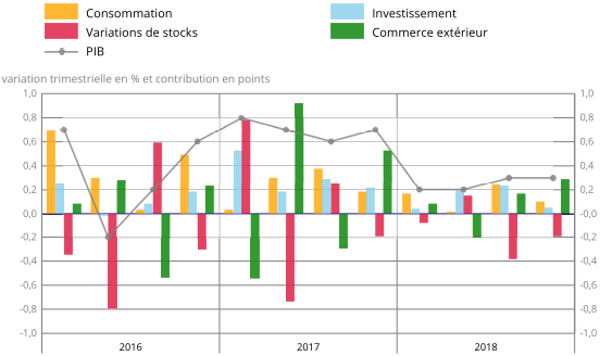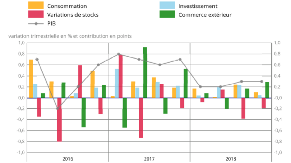 Insee'ye göre, 2018'in dördüncü çeyreğinde, GSYİH hacimsel olarak, üçüncü çeyrek ile aynı hızda arttı. (+% 0,3). Yıl boyunca faaliyet, ortalama olarak 2018'de yavaşladı: 2017'deki +% 2,3 sonrasında +% 1,5 oldu.
