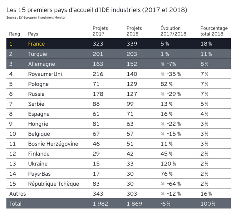 13 Ocak 2020'de yayınlanan uluslararası yatırım kararlarında yer alan 210 yönetici nezdinde yapılan bu anket, 2018'de Türkiye için 203 ve Almanya için 152 olan proje sayısına kıyasla Fransa’nın 339 DYY projesine (Doğrudan yabancı yatırım) ev sahipliği yaptığını göstermektedir. Bu yatırımlar, üretim birimlerinin oluşturulmasını veya genişletilmesini içerir. Sırayla, Brexit etkisi nedeniyle 2017'ye göre% 35 düşüşle 216 projeyle İngiltere var. Fransa aynı dönem için 5 puan, Türkiye bir puan kazanırken, Almanya yedi puan kaybetmiştir.
