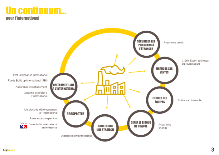 (*) Kamu Yatırım Bankası Bpifrance, şirketleri gelişimlerinin her aşamasında, kredi, özkaynak ve garanti mektubu ile finanse etmektedir. Bpifrance, inovasyon projelerinde ve yurtdışı açılımlarında şirketlere eşlik etmektedir. Bpifrance aynı zamanda ihracat faaliyetlerini de geniş bir ürün yelpazesi ile garanti etmektedir.