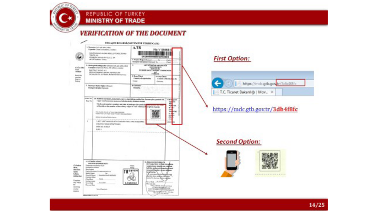 - AB'ye ithalatta, Türkiye tarafından verilen sertifikalarda ıslak imza gerekmemektedir (diğer düzenleyici hükümlere uygun olarak). Sertifikanın bir QR kodu ve bir internet bağlantısı olması gerekmektedir.