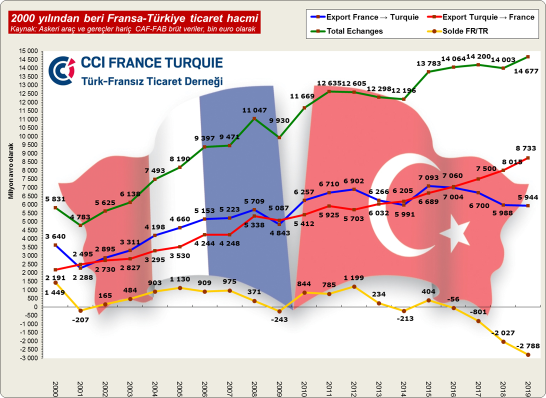 2019 yılında toplam 14.676 milyar € ile Fransa ile Türkiye ticaret hacmi, 2018'e göre +% 4,6 arttı. Fransız şirketlerinin Türkiye'ye ihracatı hafif düştü. (-% 0,7) Türk şirketlerinin Fransa'ya ihracat oranı ise arttı. (+% 9) Dört yıl üst üste iki ülke arasındaki ticaret dengesi Türkiye için karlı olup, önemli artış gösteriyor: 2016'da + 56,1 milyon €, 2017'de + 800,6 milyon €, 2018’de + 2,026 milyar € ve 2019'da + 2,788 milyar € oldu. (bkz. Tablo 1).